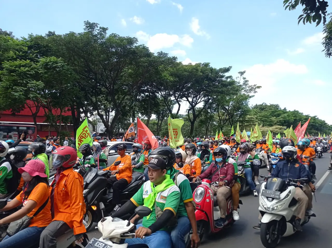 Dalam pantauan suarasurabaya.net para buruh mulai berdatangan sejak sekitar jam 10.00 WIB menuju Frontage Ahmad Yani Surabaya.