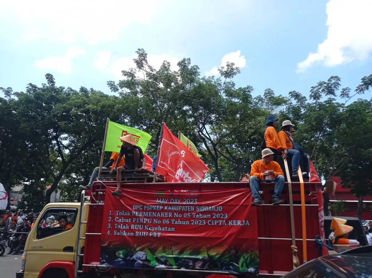 Dalam rangka memperingati May Day atau Hari Buruh Sedunia tahun 2023, ribuan buruh dari Jawa Timur mulai memadati Frontage Ahmad Yani Surabaya.